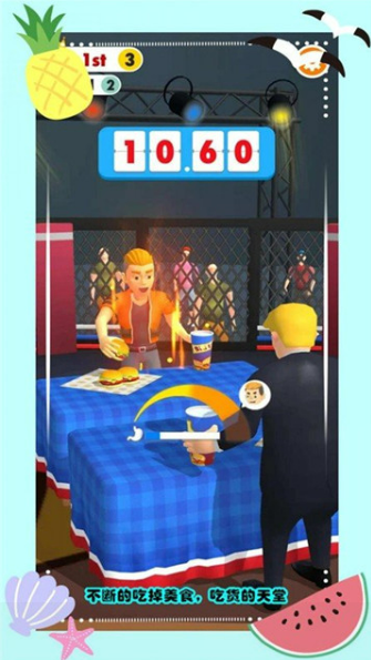 开局只能吃些汉堡薯条,但身体会越撑越大,后面连冰箱汽车都能往嘴里塞。要注意躲开比自己大的东西,不然就被吃掉了,优先找密集的小食物能长得快一些。比赛模式挺丰富,有限时三分钟的单人挑战,也能四个人联机对战比速度。角色设定比较有意思,画面做得夸张,角色从小不点变成楼房那么高,食物被吞下去的特效配上搞笑音效,玩着挺减压。