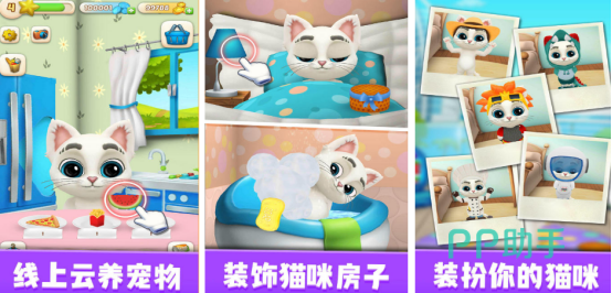 与小猫实时互动,通过触控屏幕或者语音交流的方式与其互动,汤姆猫会凭借着非常滑稽的声音复述玩家的话语,并及时做出相应的特色表情以及不同的动作,比如抚摸头部,又或者是摸肚子等等,游戏具有较为丰富的场景与生态环境,最初仅是比较老旧的巷子,而当前小猫咪也搬进了全新的公寓,公寓设定和装修风格由你来决定。