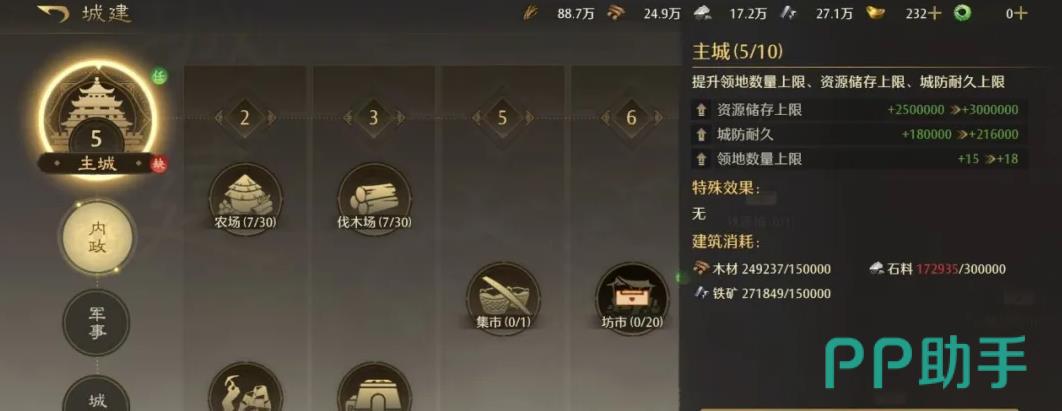 资源规划失当是新手常见问题,典型表现为木材、石材过早投入非核心建筑,拖慢主城升级进度。作为三国题材策略手游,《九牧之野》采用“主城驱动型”发展模型:前期应集中资源将主城升至5级,此为解锁外围功能区的前提;后续扩展其他区域时,须严格控制单次投入量,确保木材与石材持续向主城倾斜——主城等级直接关联建筑容量、科技解锁上限及部队上限等核心数值。