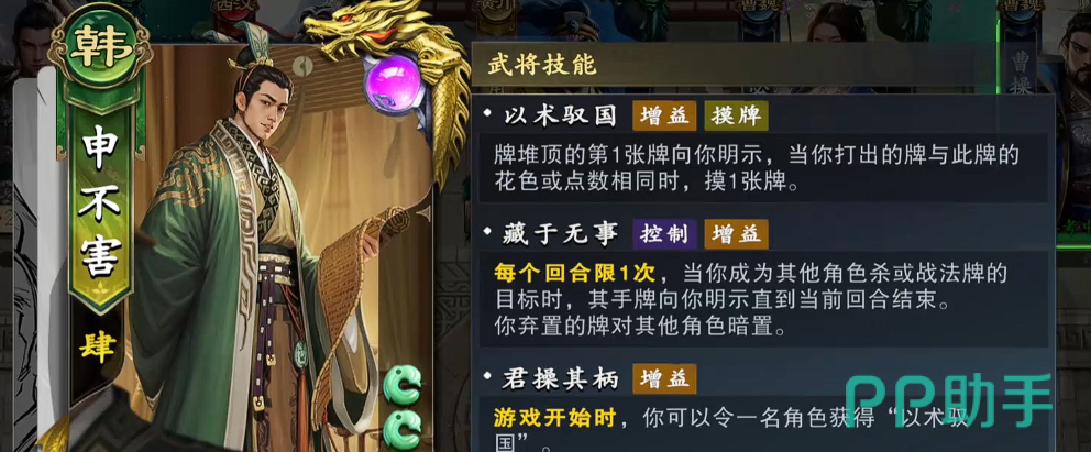 申不害的核心定位为“信息干扰型”武将。其一技能【君操其柄】可在游戏开局阶段指定一名队友,双方共同获得“以术驭国”效果——该状态持续生效的前提是申不害或该绑定队友均未阵亡。此机制天然适配鲁肃,形成稳定双核绑定结构。