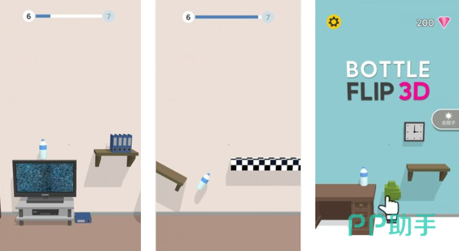 以物理模拟为核心驱动,将日常水瓶设为跳跃主体,结合家居场景构建真实空间尺度感。平台间距非固定值,部分关卡中落点平台具备横向位移、周期性升降或倾斜旋转等动态特性,取消传统辅助瞄准线,依赖玩家对蓄力时长与角度的肌肉记忆判断。关卡难度呈阶梯式递进,前中期侧重节奏把控,后期加入多重障碍组合与限时机制,考验反应稳定性与预判能力。