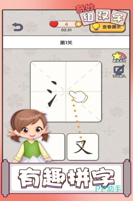 这款游戏采集了许多汉字,并将它们拆分开来,等待孩子的复原拼凑,孩子在此过程中会增加对汉字的印象。游戏的关卡数目不少,足够陪伴孩子度过数十个日日夜夜。游戏关卡难度会渐渐上升,这反而能让孩子有个适应的缓冲时间段,慢慢挑战词汇量的至极。游戏有提示功能,孩子点开就可以秒悟懂破关,不会因为久久卡关而变得不自信。