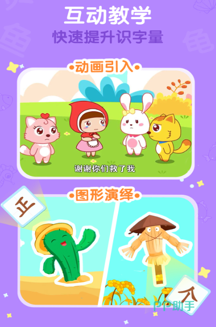 这款游戏集结了上千个汉字、词语等,并把它们结合小故事做出了绘声绘色的动画片,孩子在看的过程里,能潜移默化记住这些汉字、词语的释义和读音。游戏知道孩子爱小动物,所以把小动物拟人化,作为动画片里的主角,激起孩子的兴致。游戏还配有诗词,让孩子领先别的孩子一步接触,日后更容易适应。