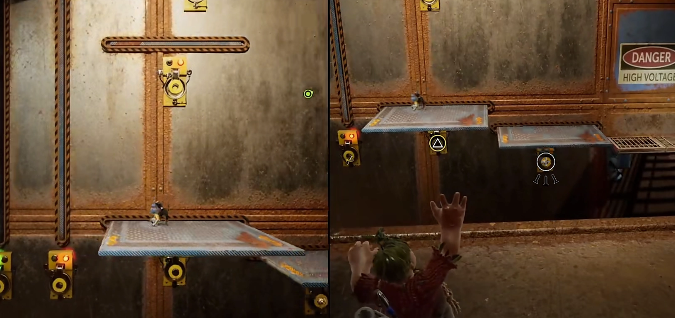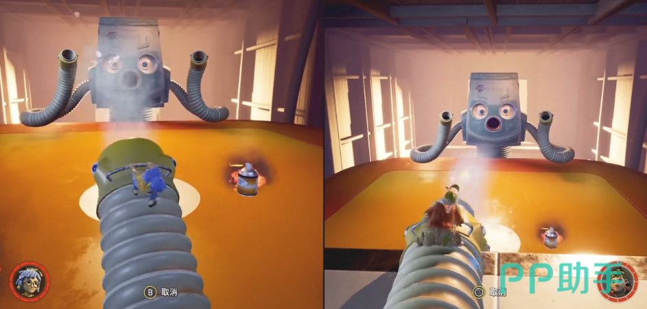 游戏采用双角色分屏操作模式,两位玩家需在独立视角下实时协同完成解谜与战斗。角色具备即时复活机制,配合密集分布的自动存档点,大幅降低挫败感;真正的挑战核心在于动作节奏同步与指令预判。例如“工具箱”章节中,一名玩家使用充气锤敲击支撑点制造弹跳时机,另一玩家须精准把握起跳帧数;在“松鼠与蜂蜜”Boss战中,需交替使用树脂喷射器与火焰枪触发持续燃烧伤害;此外,各章节均设有隐性互动节点——如俄罗斯方块房间需高频扫描墙面获取线索,雪景球场景内需与乌龟完成三次特定节奏互动,此类设计旨在引导玩家主动探索,从而解锁全成就并深入理解剧情主旨。