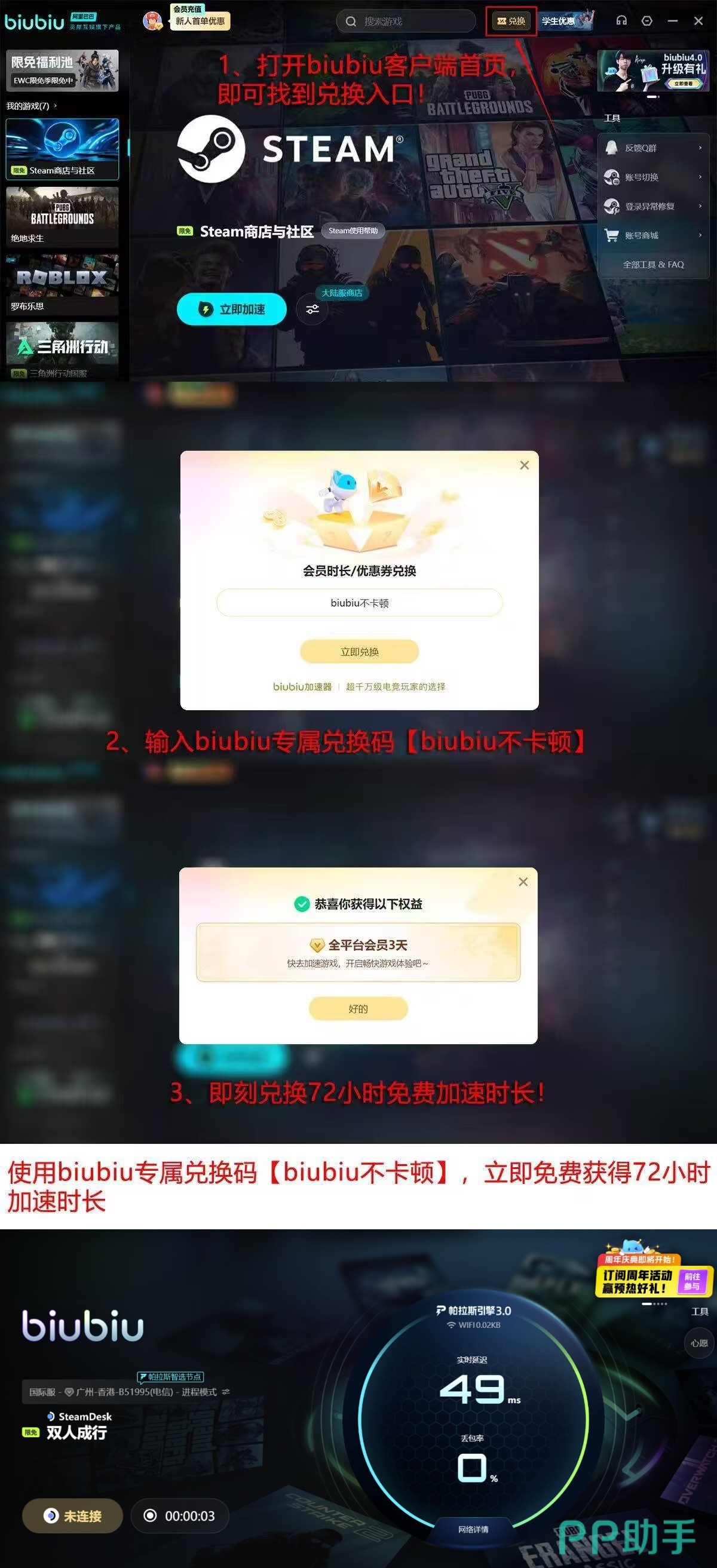 平台兼顾性能与易用性:用户输入口令【biubiu不卡顿】(须全小写、无空格)即可兑换72小时免费加速时长;所有支持游戏均可通用此权益;新注册用户完成登录后,自动获赠24小时首登体验权限。