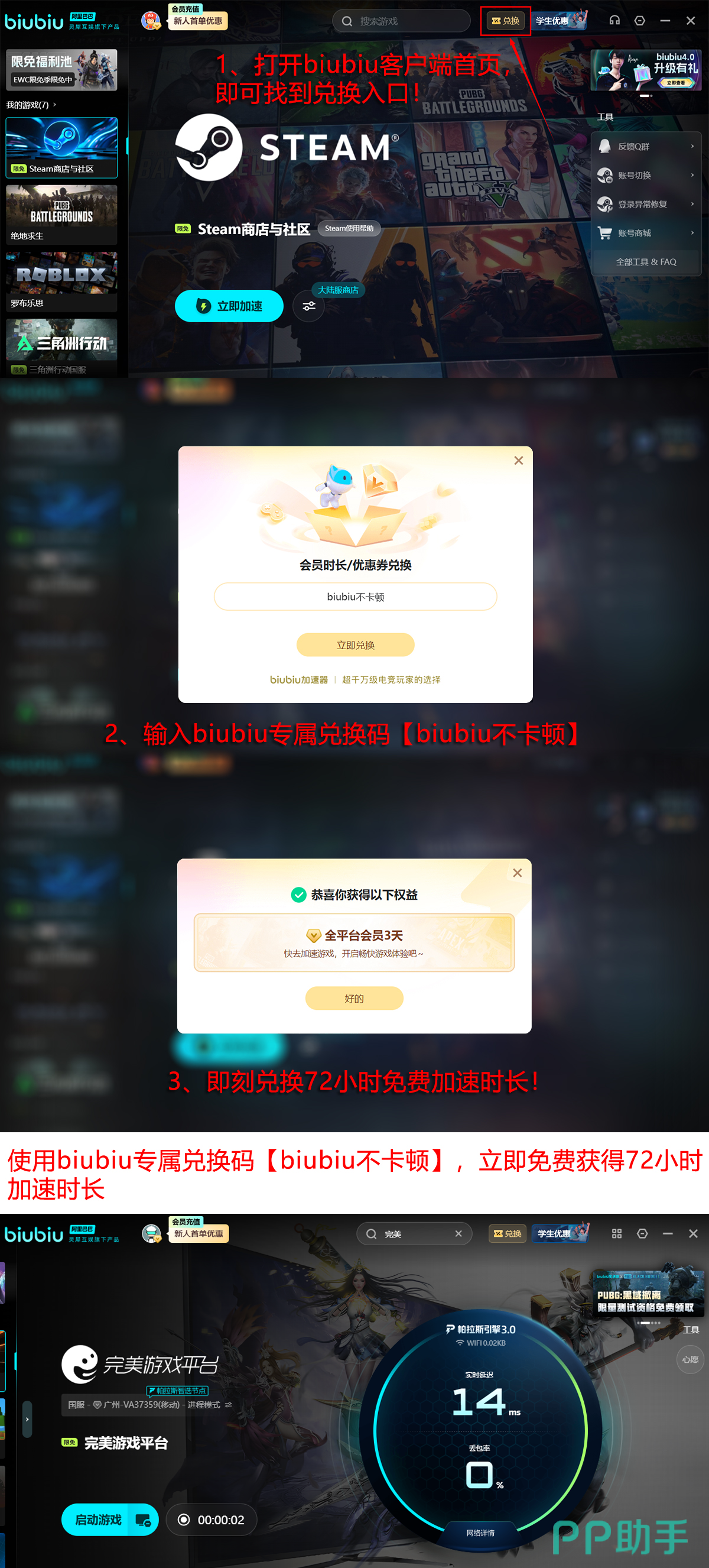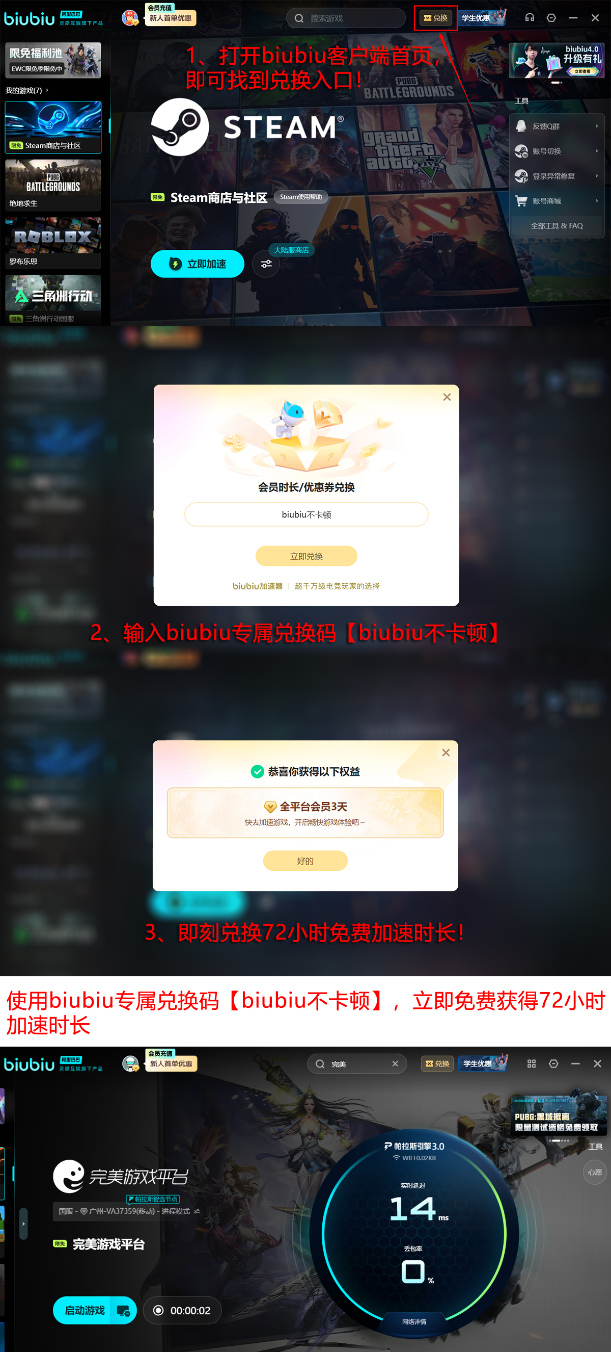 尚未使用过该工具的用户无需顾虑试用成本:新注册用户可直接领取24小时全功能免费加速时长,完成基础体验与效果验证。若需延长使用周期,所有用户(含老用户)输入兑换码【biubiu不卡顿】,即可额外获得72小时连续加速权限,满足多场排位赛或战队集训需求,助力稳定开黑、持续上分。
