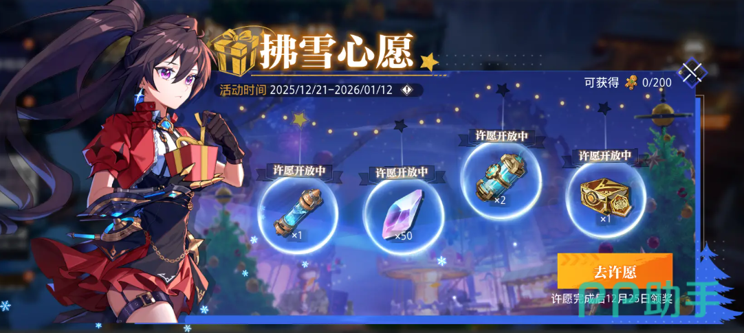 「雪季心愿」玩法于12月21日至24日期间限时开放,玩家可在银淞树场景中提交许愿请求。自12月25日起,按心愿进度分批发放回馈奖励,涵盖徽记模块自选盒、圣物之芯及晶珀三类核心资源,助力关键系统突破。