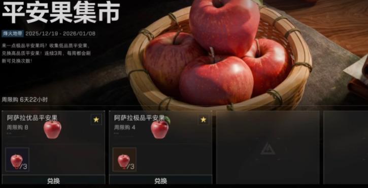 平安果集市采用阶梯式合成规则:每周兑换次数受限,三枚同品质平安果可合成一枚更高阶优品;两枚优品可进一步合成一枚极品。目前各难度地图中平安果的基础掉落率尚未公开,建议玩家前期以囤积为主,待活动中期数据明朗后再集中投入兑换。需特别说明的是,平安果存在红色稀有奖励产出路径,但保底机制可能导向怀表等其他红色道具,并非固定锁定某一种红装。