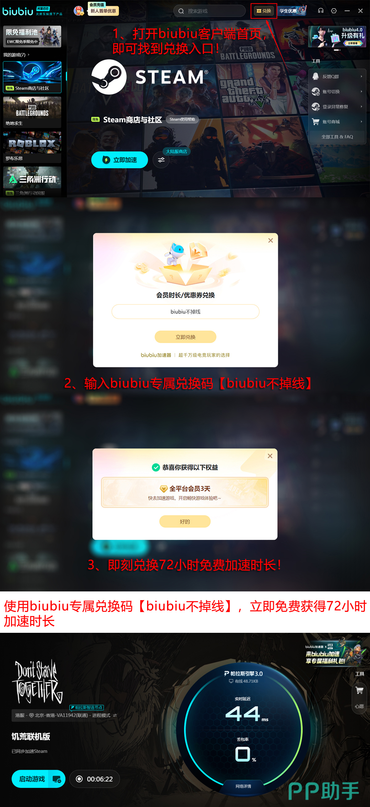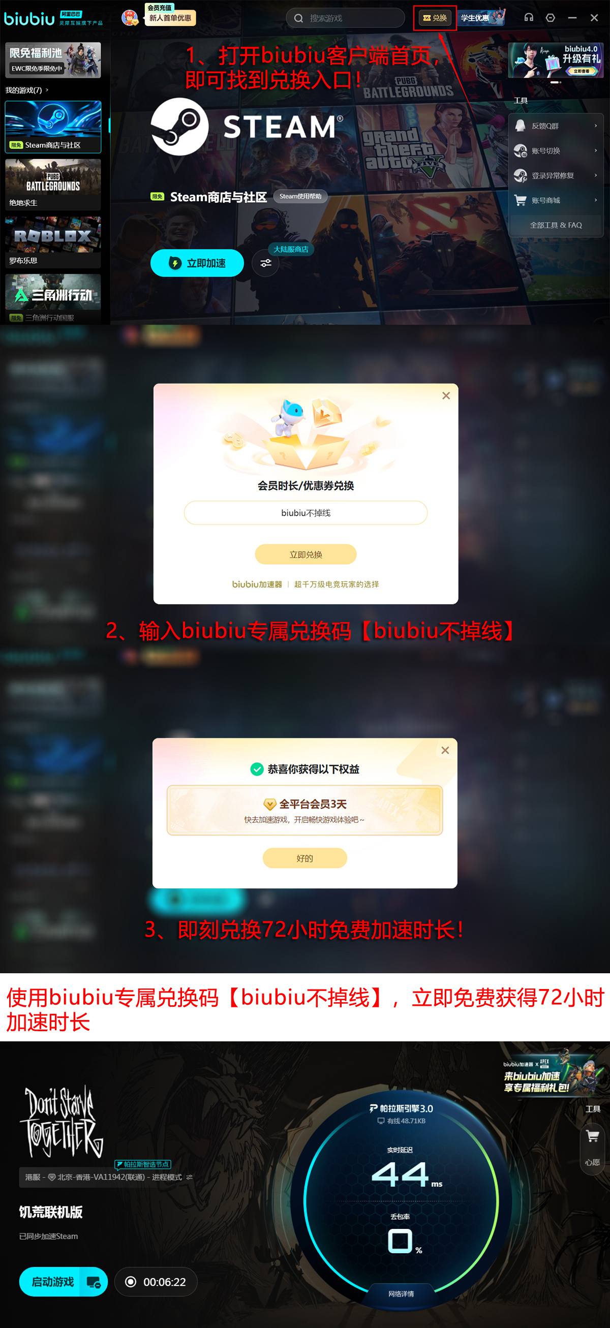 新用户注册后可立即获得首日24小时全功能免费试用权限;另输入激活码【biubiu不掉线】即可额外领取高级VIP加速时长72小时,总计享受96小时无限制加速服务,有效规避因网络问题导致的连接中断或操作延迟。
