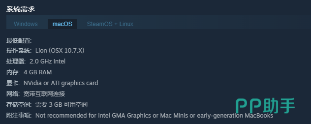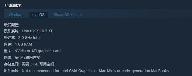 macOS用户需运行OS X Lion(10.7.x)或更高版本系统;建议搭载2GHz及以上主频的Intel处理器;内存配置不低于4GB;须配备NVIDIA或ATI(AMD)品牌的独立显卡;游戏本体安装体积约为3GB。