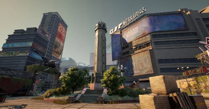 第二区域“解放碑”采用多层立体建筑结构,涵盖地下通道、露天广场及高层观景平台,地形复杂度极高。其地理中心设有一处高安防等级金库,内含镭钻类战略物资及火金宝箱,因资源稀缺性与位置枢纽性,将成为开局阶段高频交火热点。