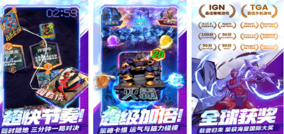 以漫威宇宙为背景的快节奏卡牌对战产品,引入动态地形系统,每局地图效果随机生成,直接影响卡牌部署与技能生效逻辑。卡牌品质共分七档,配合技能叠加机制实现战局多变性。操作界面高度简化,单局平均时长控制在3至6分钟之间,兼顾深度策略与碎片化娱乐需求。