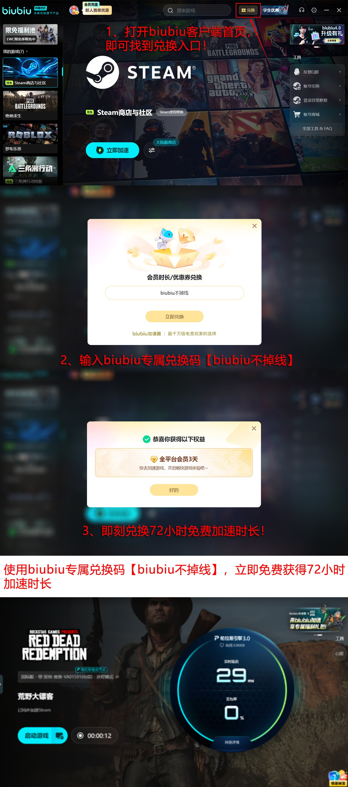 新用户注册biubiu加速器后,可立即获得24小时全功能免费试用权限;另可通过指定活动页面输入限时激活码【biubiu不掉线】,额外延长72个小时加速服务,总计享4整天无限制加速体验,充分满足西部世界深度探索与多人协作需求。