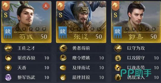 技能配置方面,荀彧主修王佐之才与驱虎吞狼,辅以天香与整军饬武,形成稳定的谋略输出+群体增益+状态清除闭环;张辽采用勇者得前、麾令嫖姚、及锋而试、箭挫其锐四连突击组合,兼顾先手压制与多段破防;郭嘉则搭载以守为攻、以攻固守、以逸击劳、诱敌深入,构建起高容错率的反打体系,可稳定触发溃散、雷雨两类稀有负面状态。