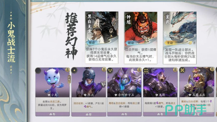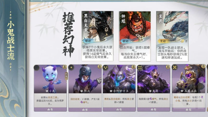 具体的玩法也是很简单的,大家只需要跟着走就可以迅速的成型。核心的成员就应该优先锁定阴兵,每一个回合在结束之后都会产生瘴气,还可以直接触发鬼将技能,然后给所有的战士增加数量。要想快速的辅助战士的成长,这里就应该选择奈何桥守卫,玄武,还有五岳卫兵。尤其是五岳卫兵,可以和小鬼直接形成联动,叠加的越高也就越猛。小鬼本身就是一个战斗力,也是关键的素材,所以就应该选择重点培养。在幻神的选择上,建议直接关注黑白无常,可以迅速的积攒小鬼,让阵容的成型速度更快一些。