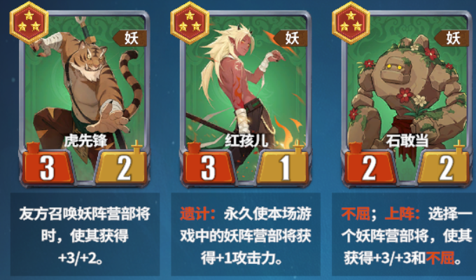 除了这两个角色之外,玩家还可以考虑一些三星角色,可以选择虎先锋,石敢当,红孩这样的角色,虎先锋前期使用是完全足够的,在战斗的过程中,妖阵营的角色都能增加2点的伤害,红孩儿的成长效果比较弱,但同样也能增加妖队伍的战斗能力,石敢当这个角色可以一直用到后期,挑战过程中能选择一个角色,增加3点的不屈能力。