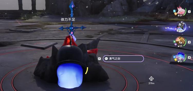 随后进入一处类似古代遗迹的封闭场地,中央可见一块被厚重岩层包裹的红色发光物体。使用跳跃攻击击碎外层岩石,即可显露其中封存的武器——即“石中之剑”。与之交互后,系统将播放一段背景叙述:胆小盔并非畏惧挑战,而是穿越风暴而来,只为完成一次试炼;可惜尚未触碰石剑便已耗尽力量。