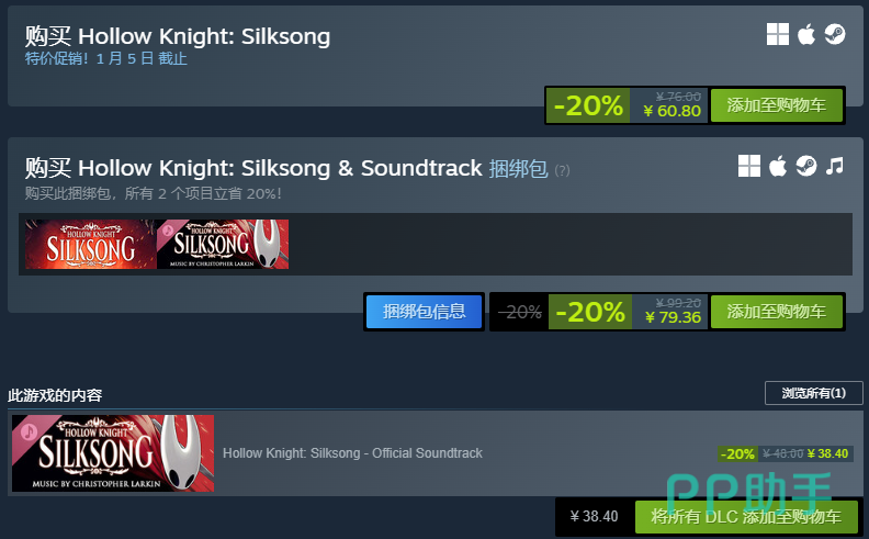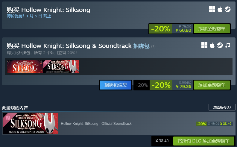 根据Steam官方页面显示,《空洞骑士:丝之歌》国区原价为76元,本次冬季特卖享8折优惠,折后售价为60.8元。值得注意的是,这是该游戏自2023年正式发售以来的首次价格调整,此前从未参与过任何阶段性的折扣活动。因此,60.8元即为当前史低价格,亦是截至目前唯一一次低于原价的公开售卖节点。结合历年促销节奏判断,下一次可能跌破该价位的时间点,或将出现在2025年暑期大促期间;而未来半年内,该价格大概率保持为全网最低成交门槛。