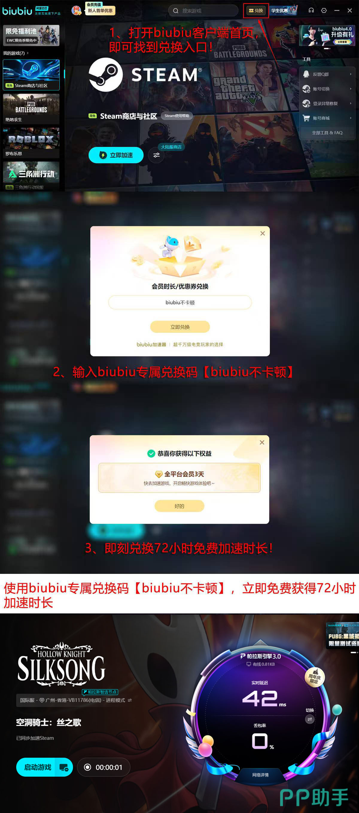 对于未列入限免名单的游戏,用户仍可通过基础福利获取加速时长:新注册账号自动获赠24小时免费使用权限;另可凭口令【biubiu不卡顿】在客户端内兑换72小时加速权益。两项叠加后,单账户最高可累计获得96小时免费加速服务。该口令无有效期限制,建议玩家按需分阶段使用,提升资源利用率。