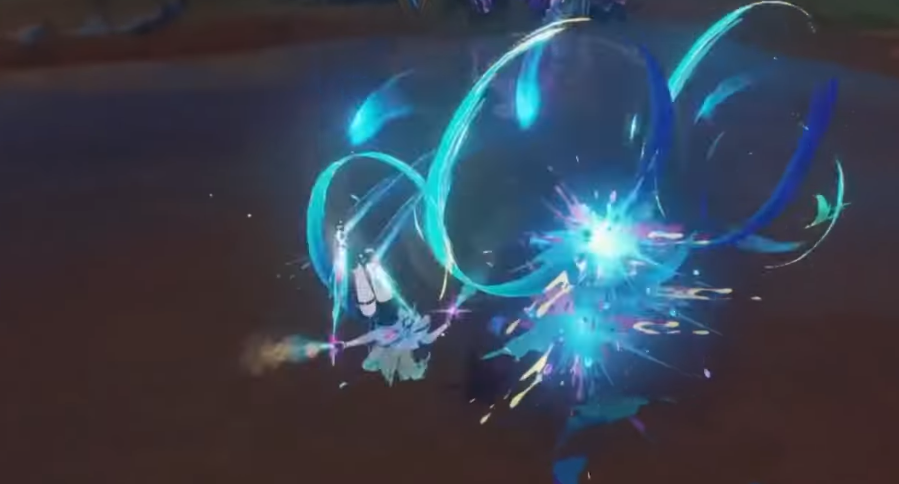 基础普攻共三段,当进入特殊阶段“光学取样”且溢彩值已满时,长按普攻可启动蓄力模式——此时溢彩将转化为流光资源,蓄力全程享受50%减伤并完全免疫打断,是目前少数无需命座即可实现稳定抗打断的角色之一。进入“绮彩巡游”状态后,普攻形态重构,最多可打出五段连续攻击,显著增强持续压制能力。