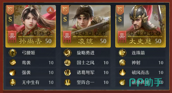 阵容配置上,推荐采用全弓兵布阵:主将孙尚香,副将凌统、太史慈,三人统一携带弓兵兵种。此举可完整激活东吴同心建筑提供的阵营增益,并触发三名弓兵S级兵种专属属性加成。太史慈兼具输出与功能双重价值,“神射”战法可在首次释放后提供2层增益,且红度达1后实现全程覆盖。
