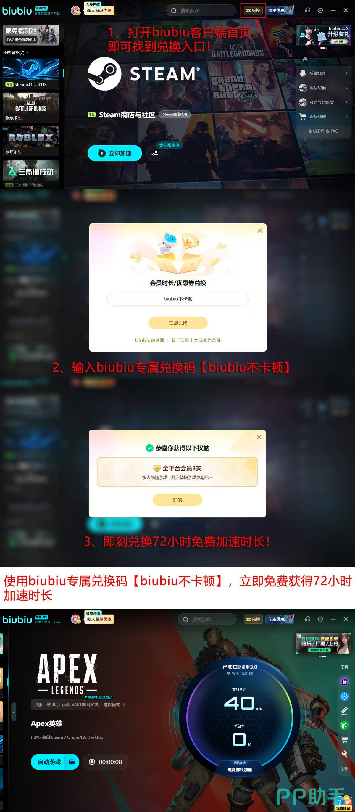 新用户注册即赠24小时无门槛加速权益,使用专属口令【biubiu不卡顿】可额外获得72小时高品质加速服务,累计免费时长达96小时。