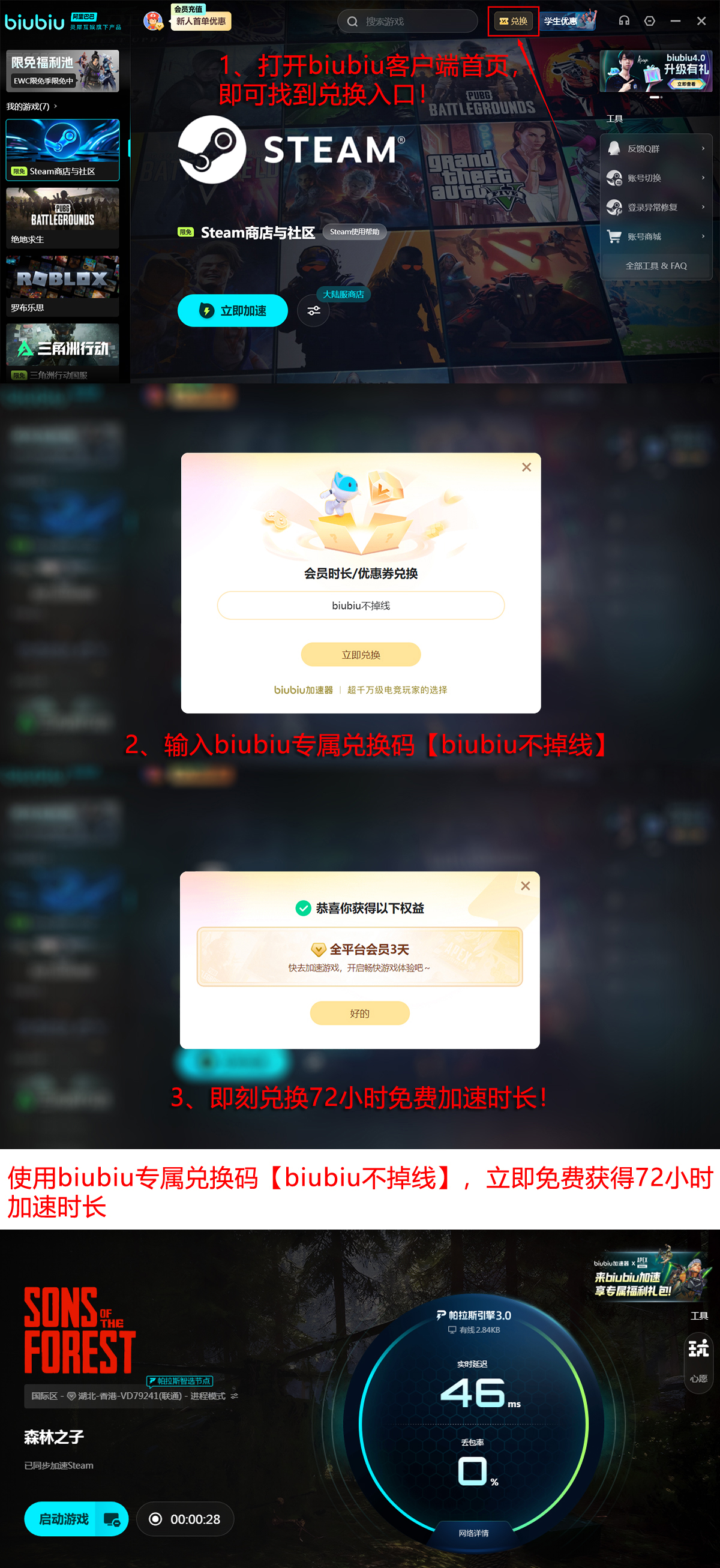 新用户注册后即可立即获得24小时全功能免费试用权限。若在首日试用期内继续使用【biubiu不掉线】服务并保持连续加速达72小时,两项权益自动叠加,总计可享长达96小时(即四整天)的无限制加速体验,零门槛切入高品质联机生存之旅。