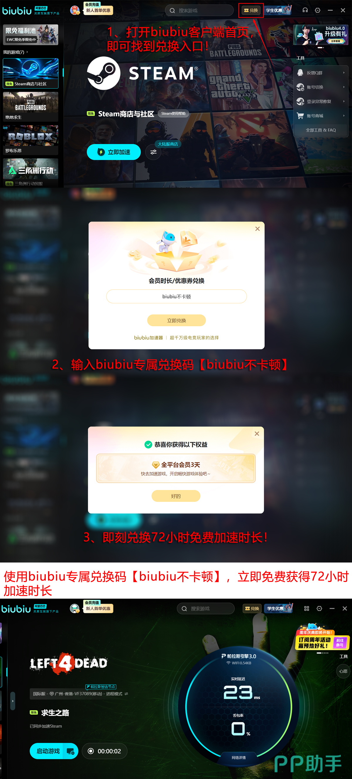 新用户注册后可立即获得24小时全游戏免费加速权限,快速接入好友房间,无缝开启合作模式。此外,所有用户输入兑换码【biubiu不卡顿】,即可额外激活3天高级加速服务,持续保障高强度联机体验。