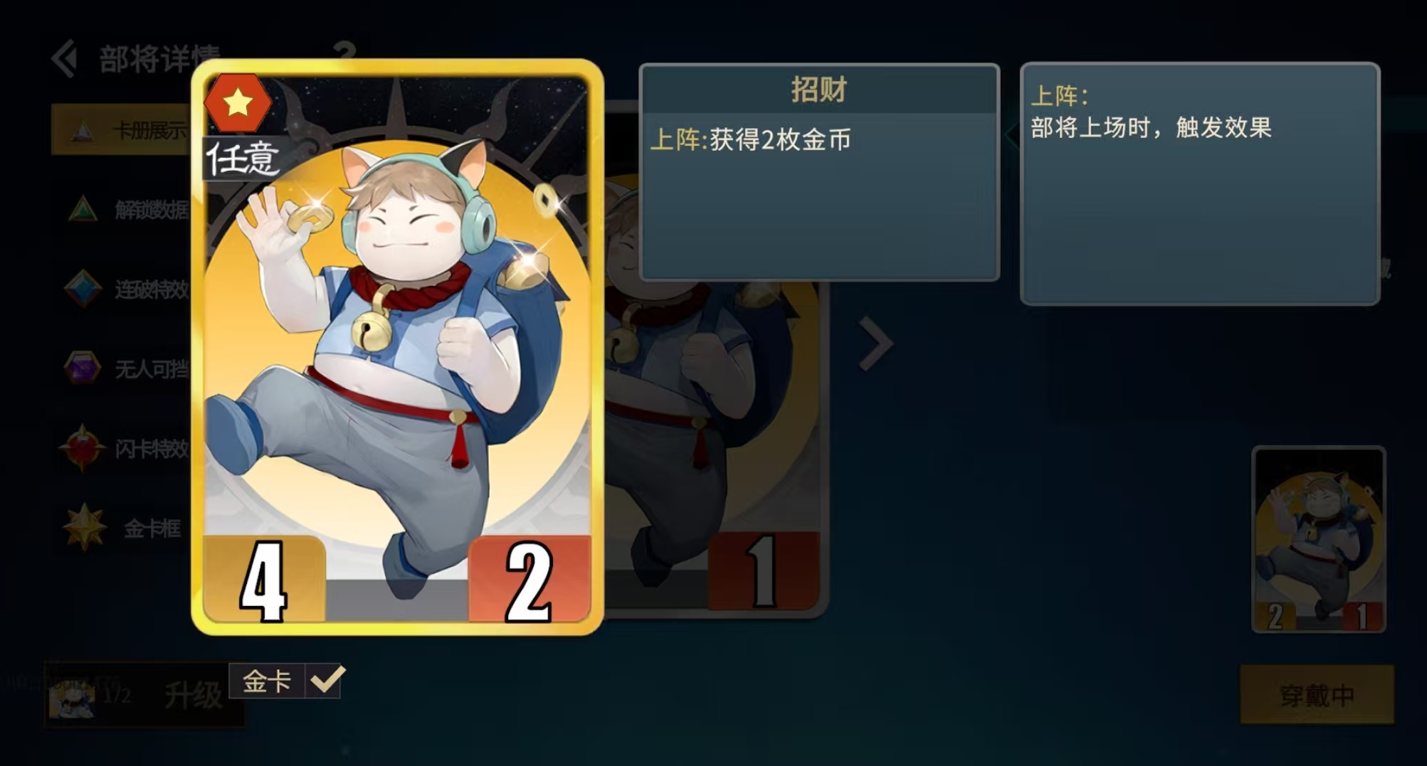 游戏内金币无复利机制,不存在“存钱生息”概念,故囤积金币不具备收益优势。真正的经济增益来源于三类稳定渠道:固定回合收入、后勤类效果加成、以及特定统帅或金卡的被动触发。基础回合金币随对局进程线性增长;而招财金卡上阵即提供2枚金币,若搭配青龙阵营的上阵效果(收益翻倍),单张即可贡献4枚金币;蜀国糜夫人在后勤位时固定获得2枚金币,若其为金卡,则直接产出4枚金币;秦阵营吕不韦则在每次斩将成功后额外获取金币。这些均为可量化、可规划的刚性经济来源。