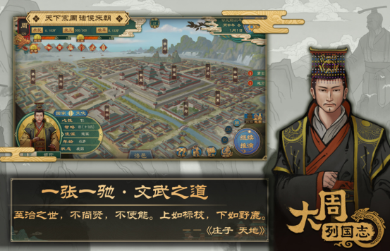深度扎根西周礼乐制度与春秋列国格局,时间跨度覆盖周初分封至战国变法前夕。玩家将扮演一方诸侯,在宗法体系约束下推进内政改革、推行井田制、兴修水利、发展礼乐教化;同时参与会盟、朝聘、征伐等真实历史事件,通过外交斡旋、联姻结盟、离间分化等方式拓展疆域。地图包含黄河中下游核心区域及周边方国,地形、气候、城池等级与资源分布严格遵循考古研究成果,实现历史逻辑与游戏机制的高度统一。