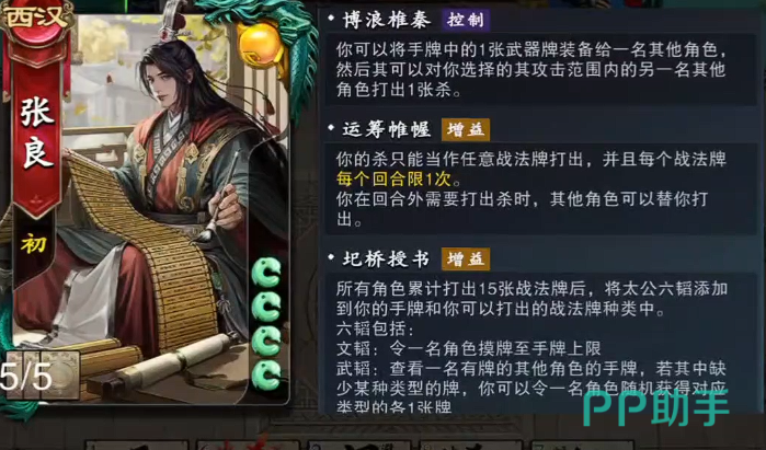 第四位是张良。主打群体压制与战术调度,其【杀】可视为战法牌,对所有其他角色造成1点伤害,且该战法牌支持灵活变体——可转化为特定功能牌(如【无懈可击】或【桃】等)使用,每回合限一次。此外,其另一机制要求:当张良打出【杀】时,可指定一名其他角色代替自己承受该【杀】的全部效果;若对方拒绝,则张良自身须承担对应结果。此设计兼顾输出广度与生存博弈,策略深度突出。
