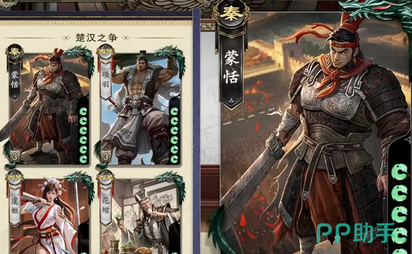 第二位是蒙恬。他以高容错率和持续成长性见长。被动技能使其每回合稳定摸取三张牌,手牌基数优势直接提升防御稳定性;若本回合未受到任何其他角色使用的【杀】或锦囊牌影响,还可额外再摸一张,形成越拖后期越强势的节奏曲线。其二技能允许将指定【杀】的目标转移至自身,尤其在主公局中可主动承担伤害,实现关键保护,战术价值极高。