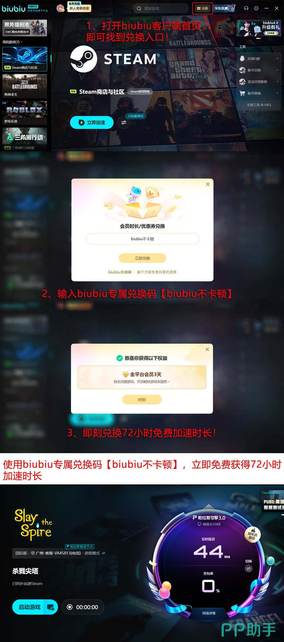 除商城加速权益外,新注册用户还可叠加多重免费时长福利:账户开通即获24小时基础加速时长;参与指定活动并输入口令【biubiu不卡顿】,即可额外领取72小时,总计达96小时免付费使用周期。整个兑换流程简洁明确,平均耗时约一分钟即可完成全部激活步骤。