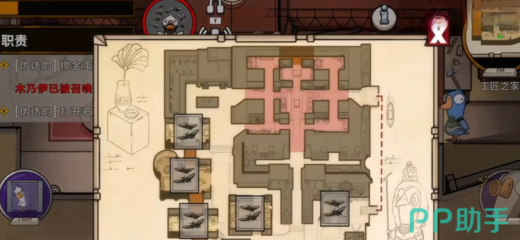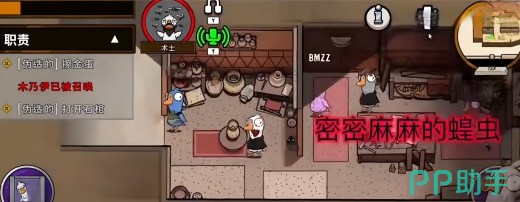 术士不具备常规鸭子的破坏类技能,所有行动均依赖“召唤蝗虫群”这一唯一主动能力。该技能需通过破坏菜单选择指定房间释放,生效后蝗虫群将在目标房间内持续蔓延,对范围内所有玩家造成无差别伤害——无论敌我,15秒内必致死亡。值得注意的是,即使术士本人被击杀,已释放的蝗虫群仍会继续存在并维持完整效果。