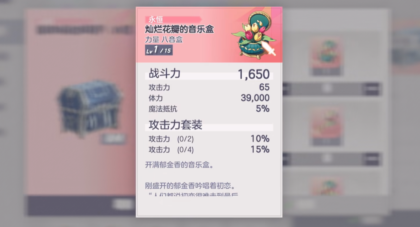 另一核心单品“灿烂花瓣·音乐盒”,定位力量型首饰,单件即提供39000+体力与高额魔法抗性,显著强化角色生存韧性。其单体防御向属性尤为突出,若主力输出位已有成熟饰品配置,建议将其分配给坦克类角色,以最大化生命值与物理/魔法双防收益。