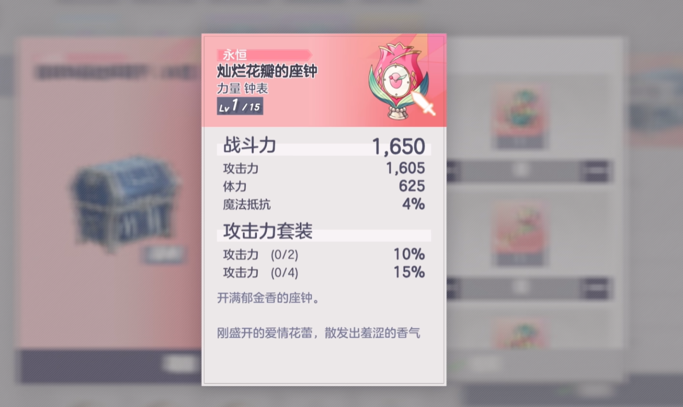 具体来看,“座钟”单件提供超1000点战力、大量体力与抵抗力加成;集齐四件套时,可激活15%攻击力提升。该套装特别适配梅菲斯托佩莱斯等高输出型角色。同时支持灵活拆分:例如保留座钟+桌镜组成两件套,再搭配其他套装的另两件,实现双套装效果叠加。值得注意的是,即便主C装配完善,仍需搭配治疗型辅助角色(如天使系)以保障持续作战能力。