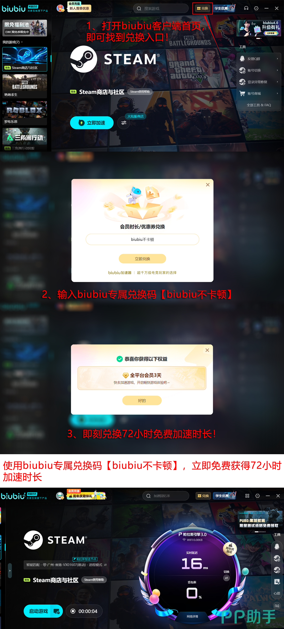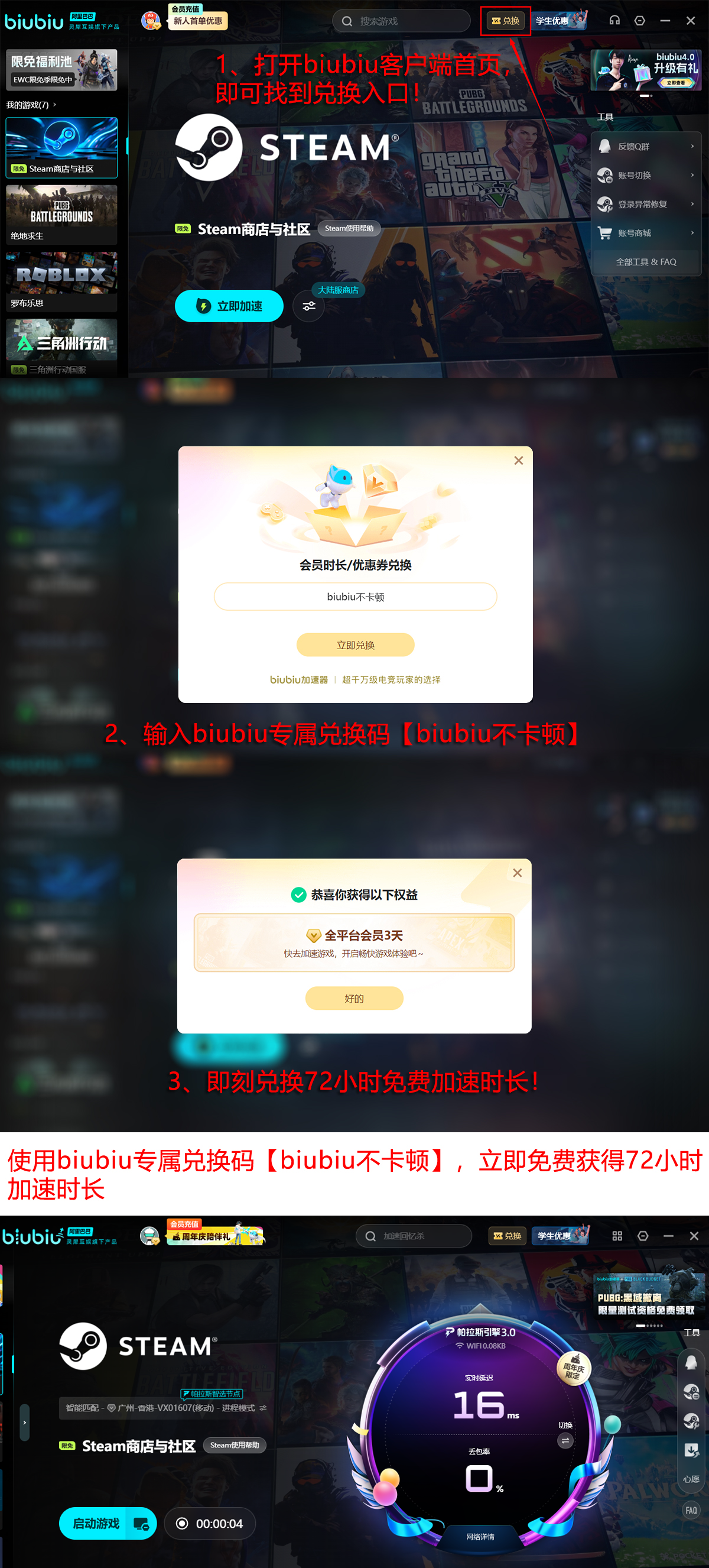 biubiu加速器面向新用户开放24小时全功能免费试用,注册即生效。现有用户及新注册账号均可凭兑换码【biubiu不卡顿】额外领取72小时加速时长,累计可支持完整赛季周期内的全部线上对战需求。首登用户更享96小时连续加速权益,充分覆盖训练、季前赛、常规赛至季后赛全流程。