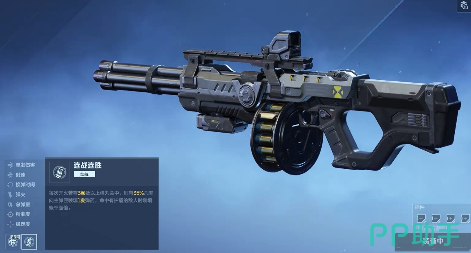 以通用霰弹枪“飓风之锤”为例:其主动技能为四连发射击,被动效果为每次射击3发后有概率自动补充1发弹药。据此可制定如下插件策略——一号位选用“扩容弹匣”,同步提升弹匣容量与换弹速度,缓解近战持续压制时的补给压力;二号位装配“多重激发”,该插件在单次开火触发多次伤害时可为主动技能充能,完美匹配四连发节奏;三号位配置“近距增幅”,强化贴身作战下的基础伤害输出;四号位推荐固定使用“杀戮连锁”,该插件具备全武器兼容特性,可延伸弹道效果,显著提升多目标覆盖能力与实战容错率。