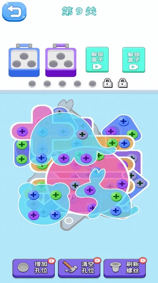 核心玩法围绕螺丝解锁与图形消除展开,图形层叠分布且存在多重绑定关系——单颗螺丝可能同时固定多个异形图案。玩家需逆向推演拆解顺序,优先处理关键连接点。系统集成双轨消除体系:基础螺丝可存入通用槽位;同色螺丝三连则触发专属清除,增加资源管理维度与操作策略性。
