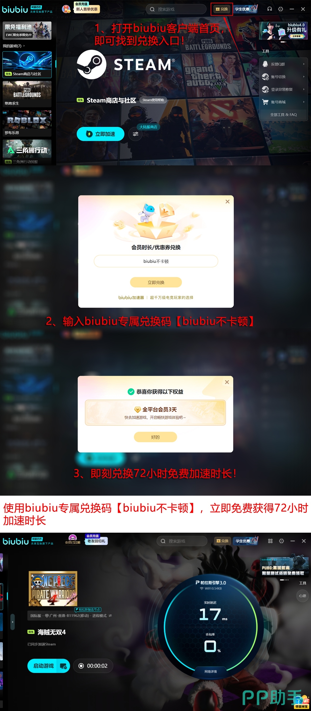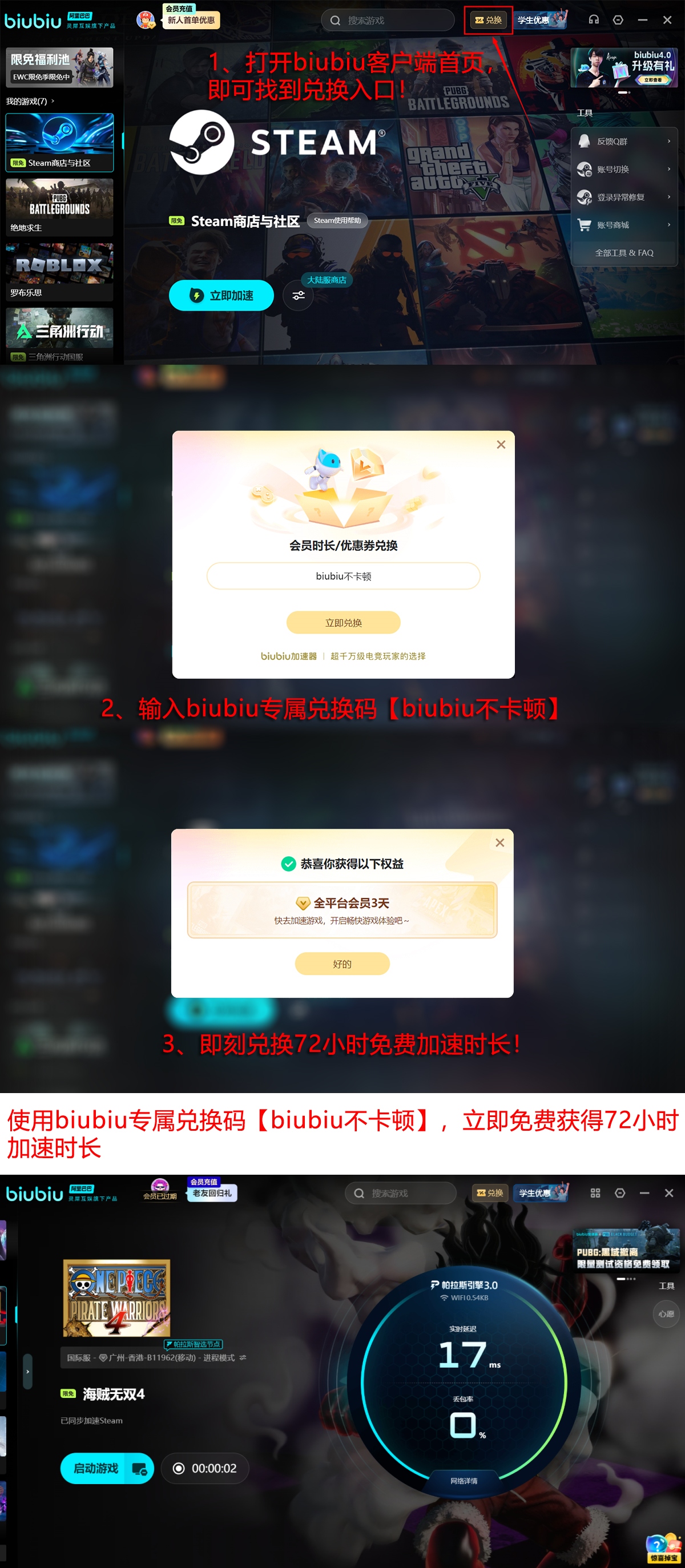 新用户注册即赠24小时免费加速时长;另提供专属激活口令:biubiu不卡顿,输入后可额外领取72小时加速权益。首登用户累计享有96小时无门槛体验,零费用享受职业级网络保障。