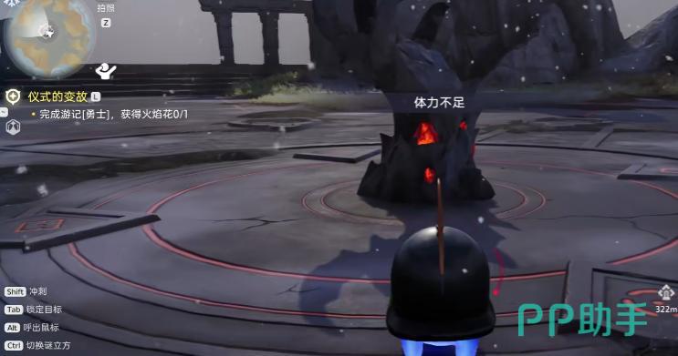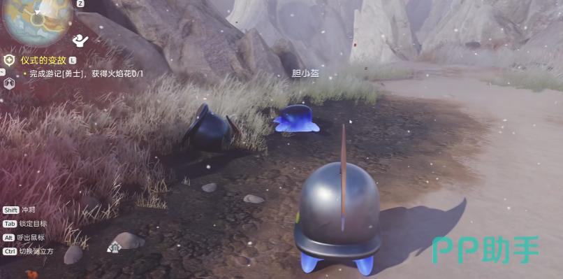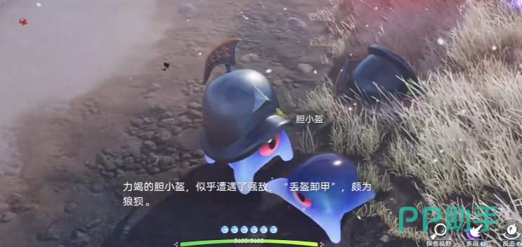 该任务需推进至特定主线节点:玩家需先寻获地图中名为“胆小盔”的NPC。这位角色并非普通路人,而是剧情引导者——他会主动现身、主动对话,并带领你穿越数段路径,最终抵达遗迹入口。抵达后,他将倒地失去行动能力,此时请操控自身携带的大眼盔与其进行交互,触发后续流程。