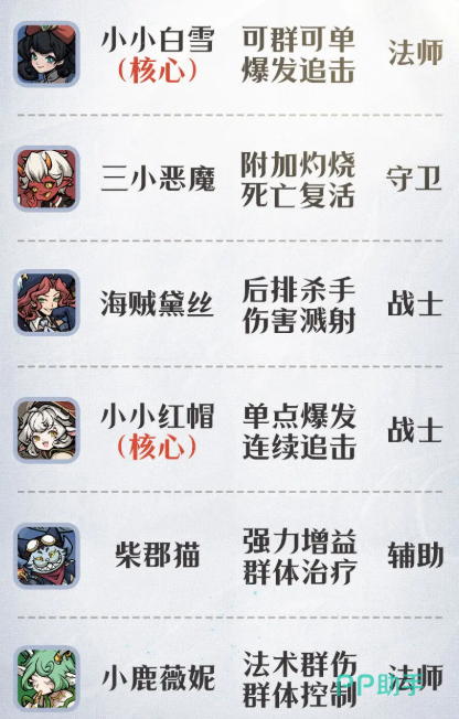 初期阵容选择直接影响推图效率与资源积累速度。推荐采用“小小白雪+三小恶魔+海贼黛丝+小小红帽+柴郡猫+小鹿薇妮”的六人组合。该配置兼顾输出、生存、控制与辅助,养成门槛低,升星跨度广(从低星至15星均具备实战价值),尤其适合资源有限的新手阶段。