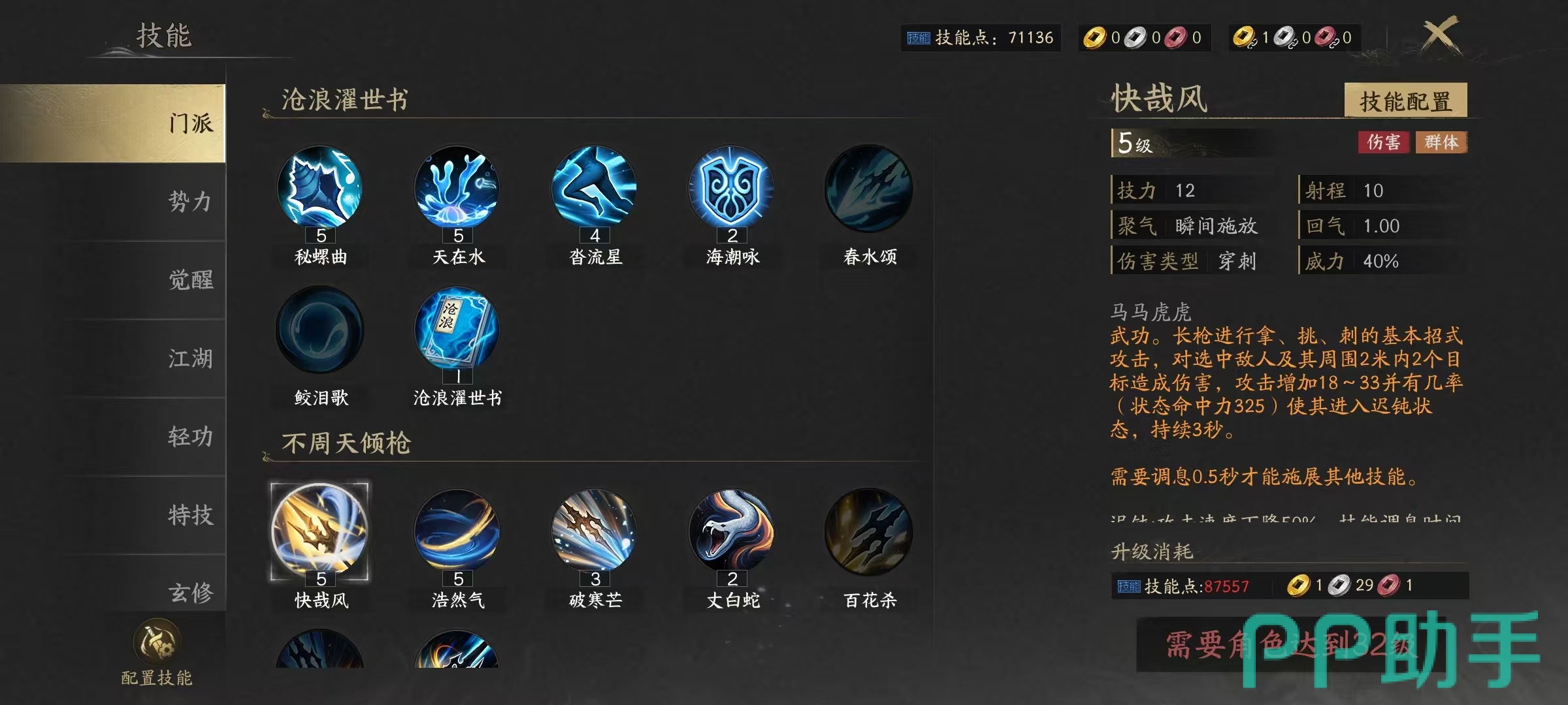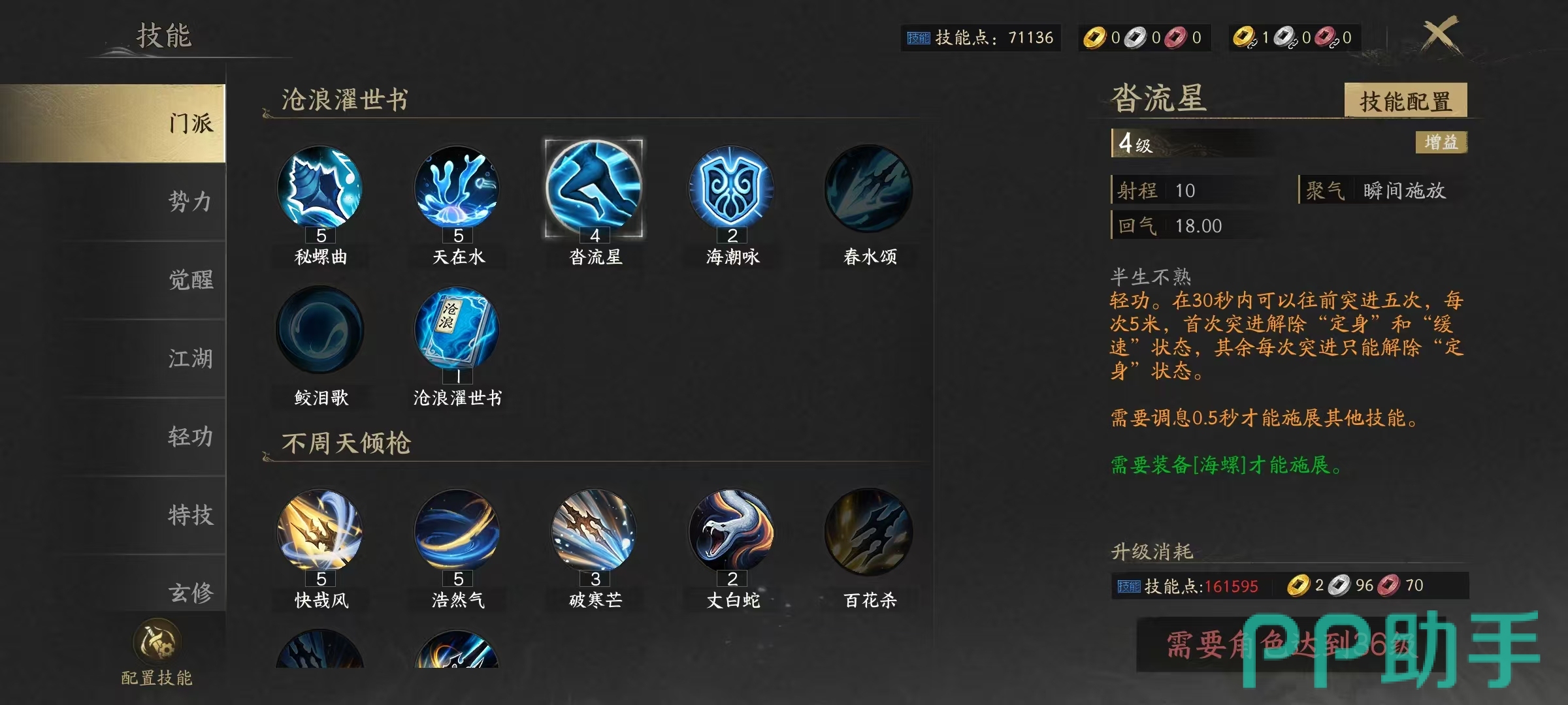 技能体系方面,玄溟拥有五项关键主动技能:首推“沓流星”,作为核心位移技,具备多段突进效果,可向不同方向连续闪现,并自动清除定身、缓速等负面控制状态,是连招起手、反打脱身或衔接爆发的枢纽技能;第二为“丈白蛇”,主输出技,伤害随目标距离动态变化,同时附带破甲与生命值转化攻击力效果,需严格把控施放距离以达成最大收益;第三是“浩然气”,物理类心法,依据力属性加成提升基础物理攻击;第四“百花杀”兼具近身伤害与硬控能力,命中后可限制敌方行动;第五“快哉风”为基础物理攻击技能,命中后有概率附加迟钝效果,是压制对手走位的重要辅助手段。