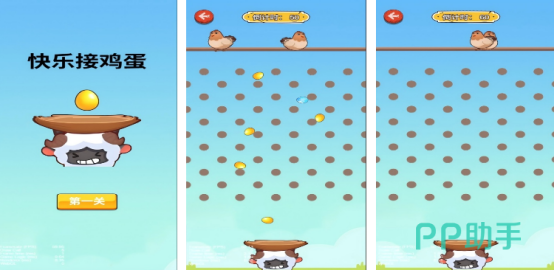 竖屏单指操作设计,上手门槛极低。画面简洁清爽,核心机制为实时接落:上方随机生成不同大小、颜色及下坠速度的鸡蛋,玩家需左右滑动底部托盘进行承接。每成功接住一枚得固定分数,连续接取触发连击加成;同时需主动规避突然出现的石块、钉子等破坏性障碍物。节奏由缓至急,考验手眼协调与预判能力,适合碎片化时间快速体验。