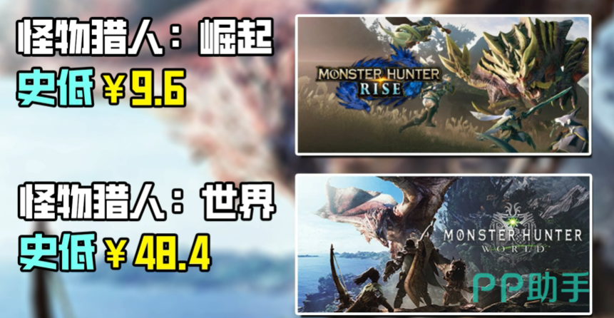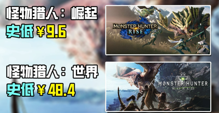 《怪物猎人:崛起》现价9.6元,《怪物猎人:世界》48.4元,均为历史最低。前者主打高速机动战斗与和风生态体系,后者侧重拟真生态交互与硬核狩猎流程。二者均包含完整武器树、配装系统(BD)、怪物图鉴收集及多人联机大厅功能,内容体量扎实,长线可玩性强。