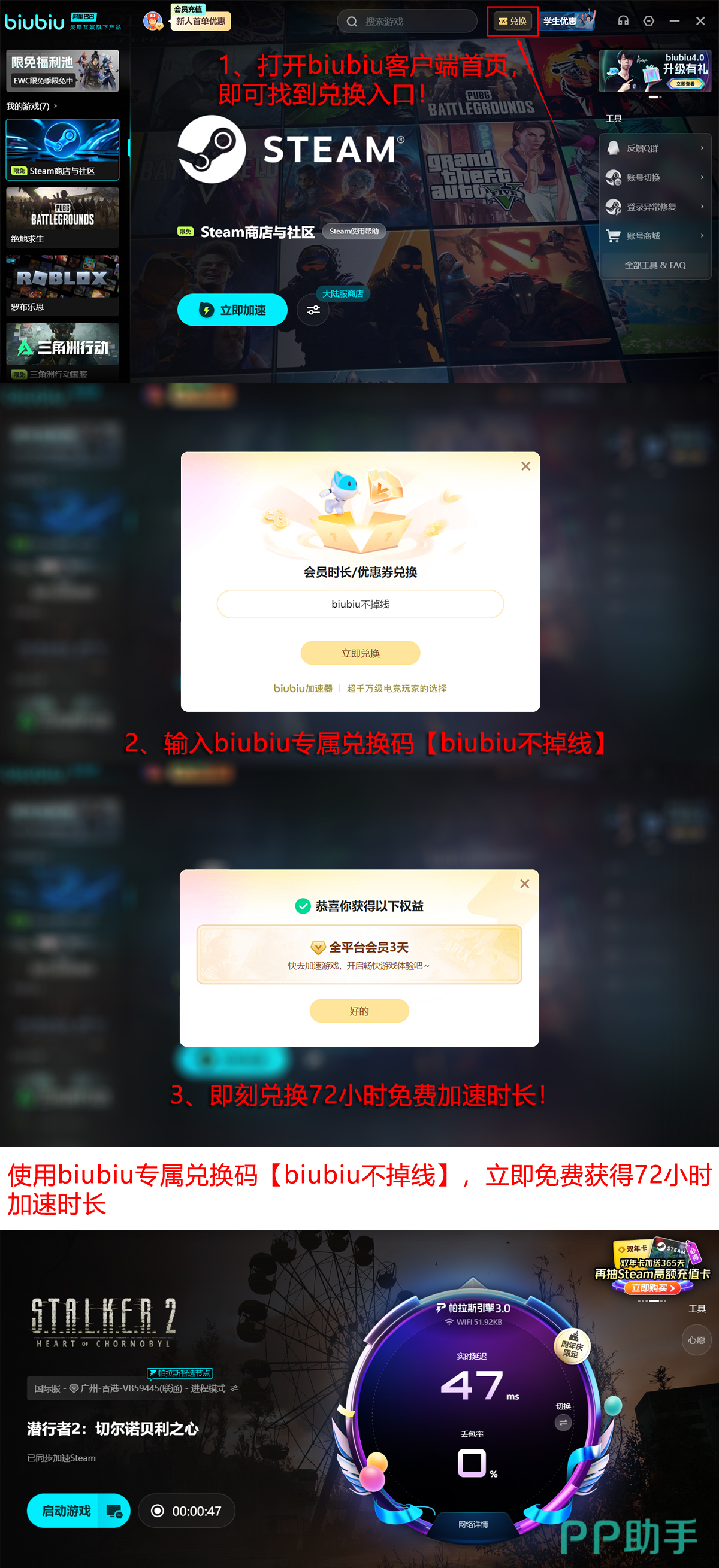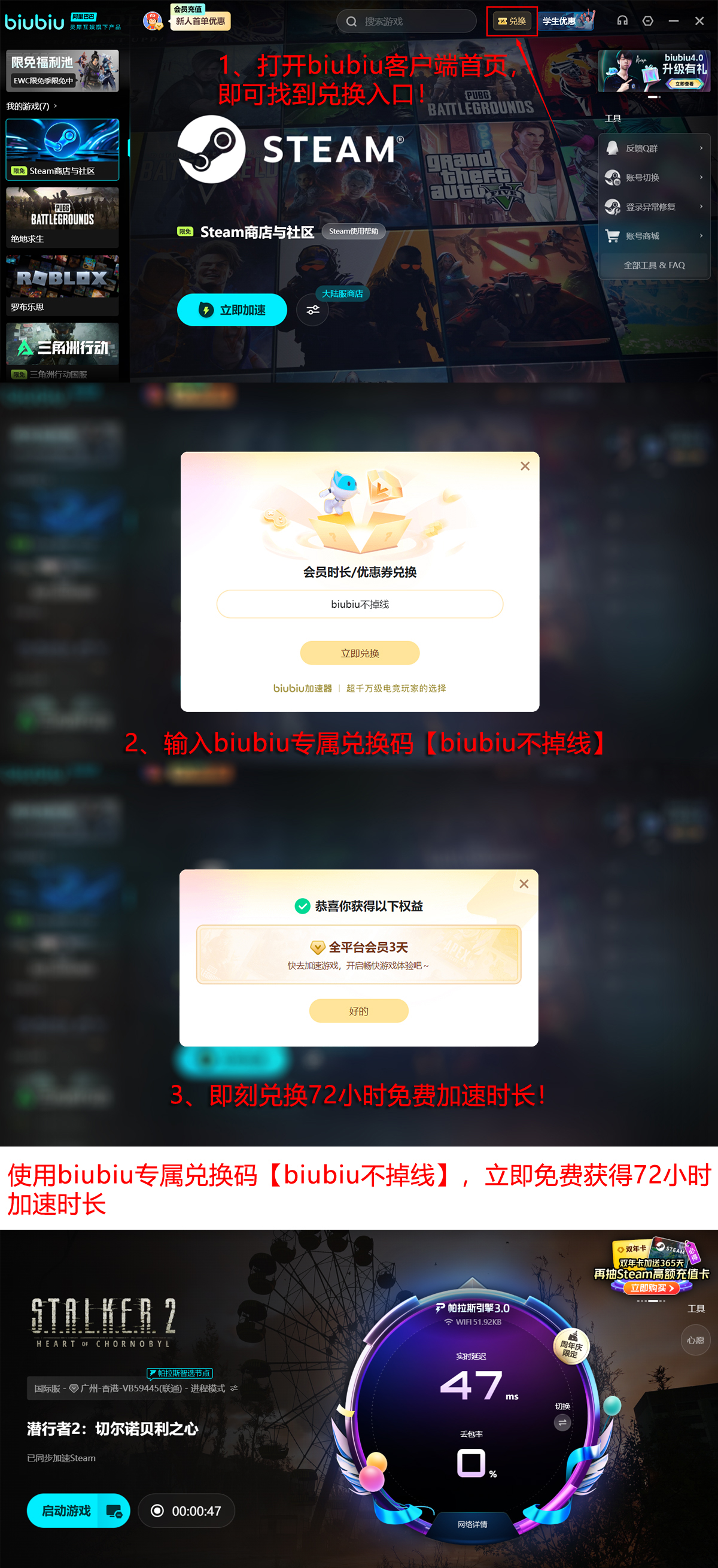 当前用户可凭密钥【biubiu不掉线】免费激活72小时高级服务;新注册用户额外获赠24小时,累计可享长达96小时的无延迟游戏体验。