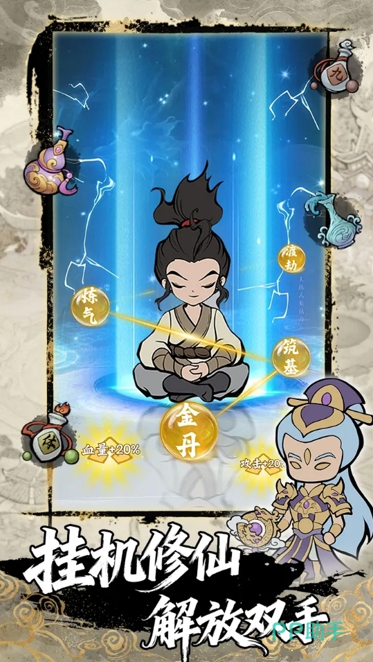 作为竖屏修真养成代表作,本作核心采用离线挂机+主动突破双轨成长模型。打坐即提升真元,闭关可突破境界,境界数值实时影响战力与解锁权限。游戏内置多重动态秘境(如寒髓洞、焚心渊)、异兽图鉴(含雷犼、烛阴等上古凶兽),并提供完整炼丹淬器链路——采集灵药炼制九转金丹,熔炼星陨铁锻造本命飞剑,最终渡劫飞升后可开宗立派,收徒授业,自建宗门传承体系。