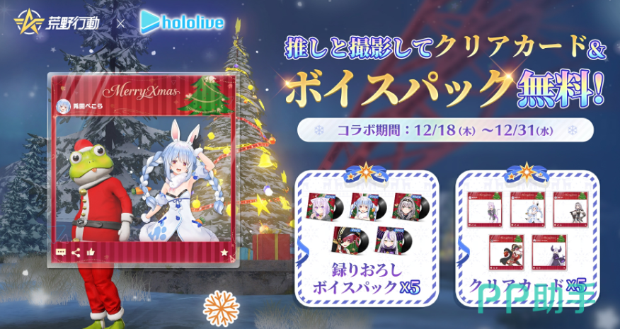 《荒野行动》日服凭借持续更新的本地化运营策略与高频次限定联动活动,持续吸引着大量海外玩家关注与参与。继首次合作后,《荒野行动》日服正式官宣与hololive展开第二轮大型联动,本次合作以“圣诞狂欢”为核心主题,已于12月18日全面上线,活动周期覆盖至12月31日,为期共14天。