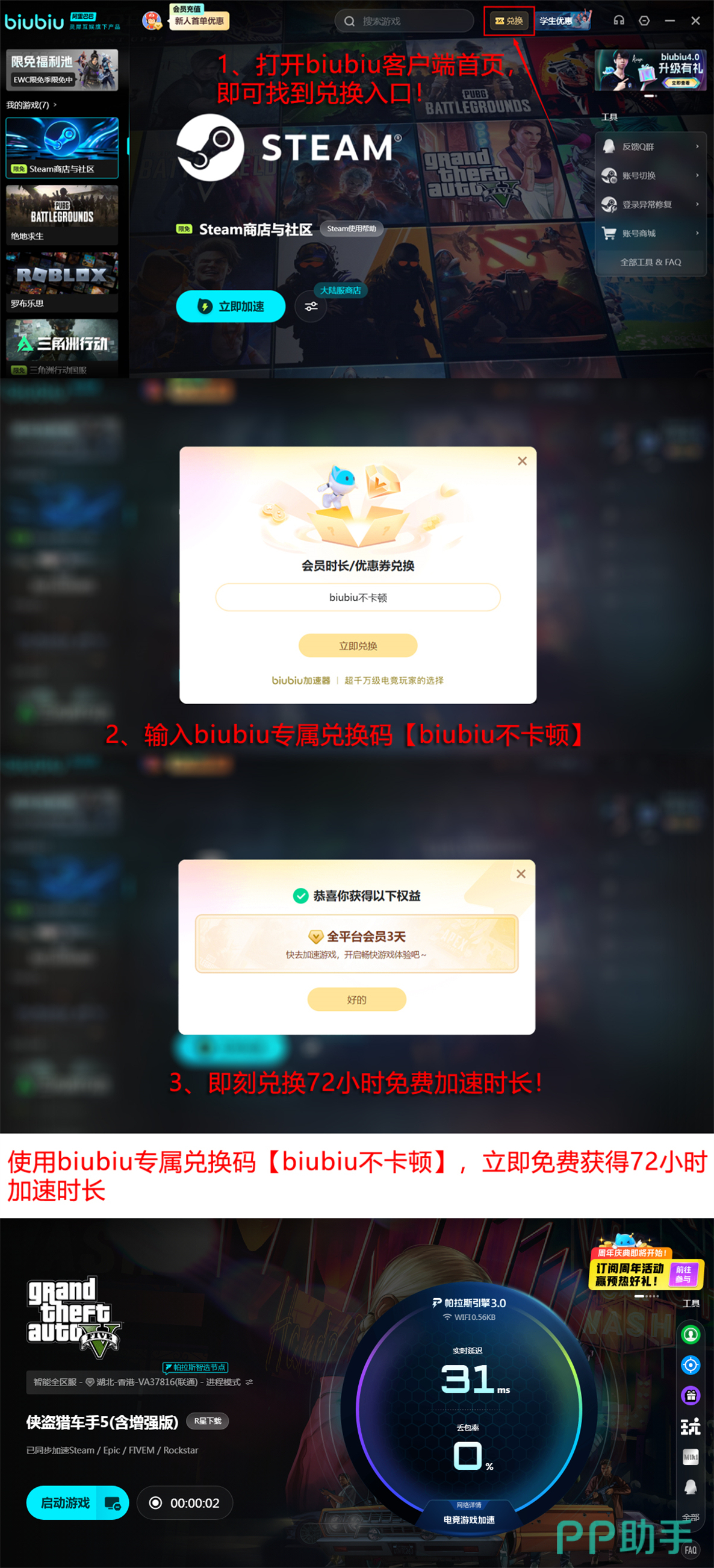 新用户注册后可立即启用免费加速服务,首账号享24小时无限制使用权限。另设通用福利:所有账户均可凭兑换码【biubiu不卡顿】领取72小时加速时长,该权益不限新老账号,支持重复激活。建议首次遇到联机障碍时优先尝试该组合方案,多数情况下可在5分钟内恢复稳定战局接入。