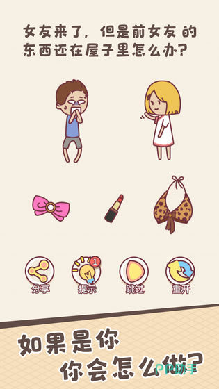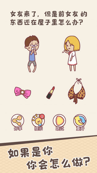 游戏涵盖多重荒诞情境设计,例如“现任女友到访,前任遗留物品仍在房间”这一典型矛盾场景。玩家须在不触发冲突的前提下完成物品处置,答案往往跳出物理处理逻辑,转向心理暗示、时间错位或行为重构等非常规策略。提示次数受通关进度制约,通关频次越高,可调用的辅助资源越丰富,形成正向激励闭环。